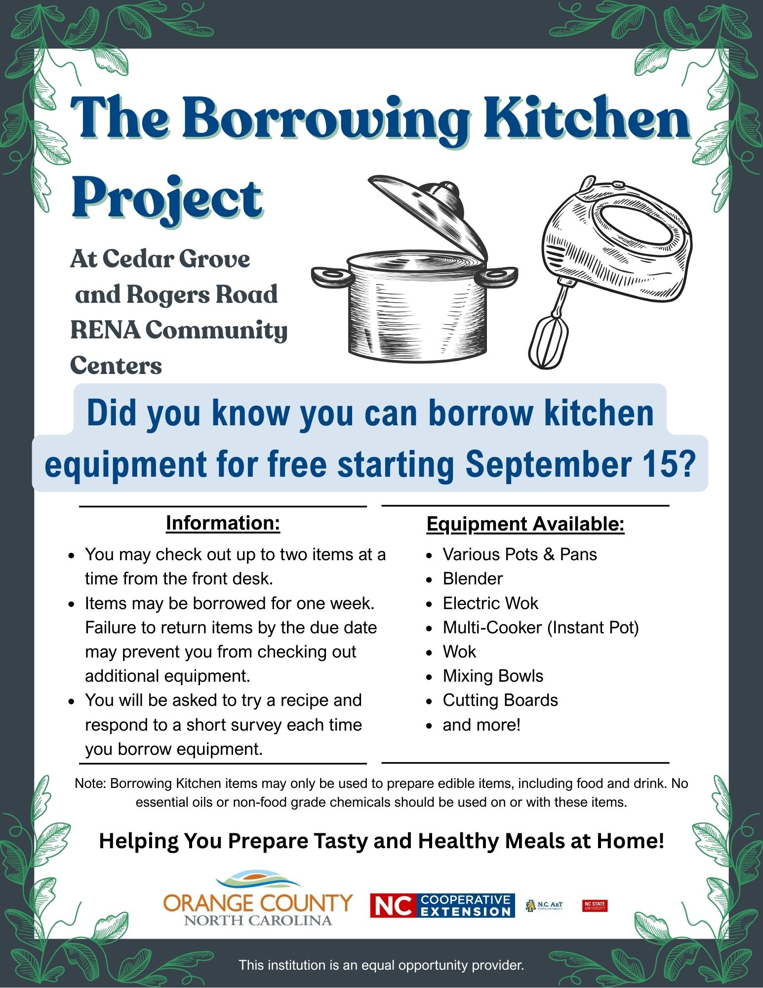 N.C. Cooperative Extension, Orange County Center, in partnership with Cedar Grove and Rogers Road RENA Community Centers, is excited to launch a new Kitchen Equipment Borrowing Program. This free pilot program aims to make healthy cooking more accessible by providing local residents with access to kitchen tools that may be too expensive or unavailable at home. We believe everyone deserves the chance to prepare nutritious meals.